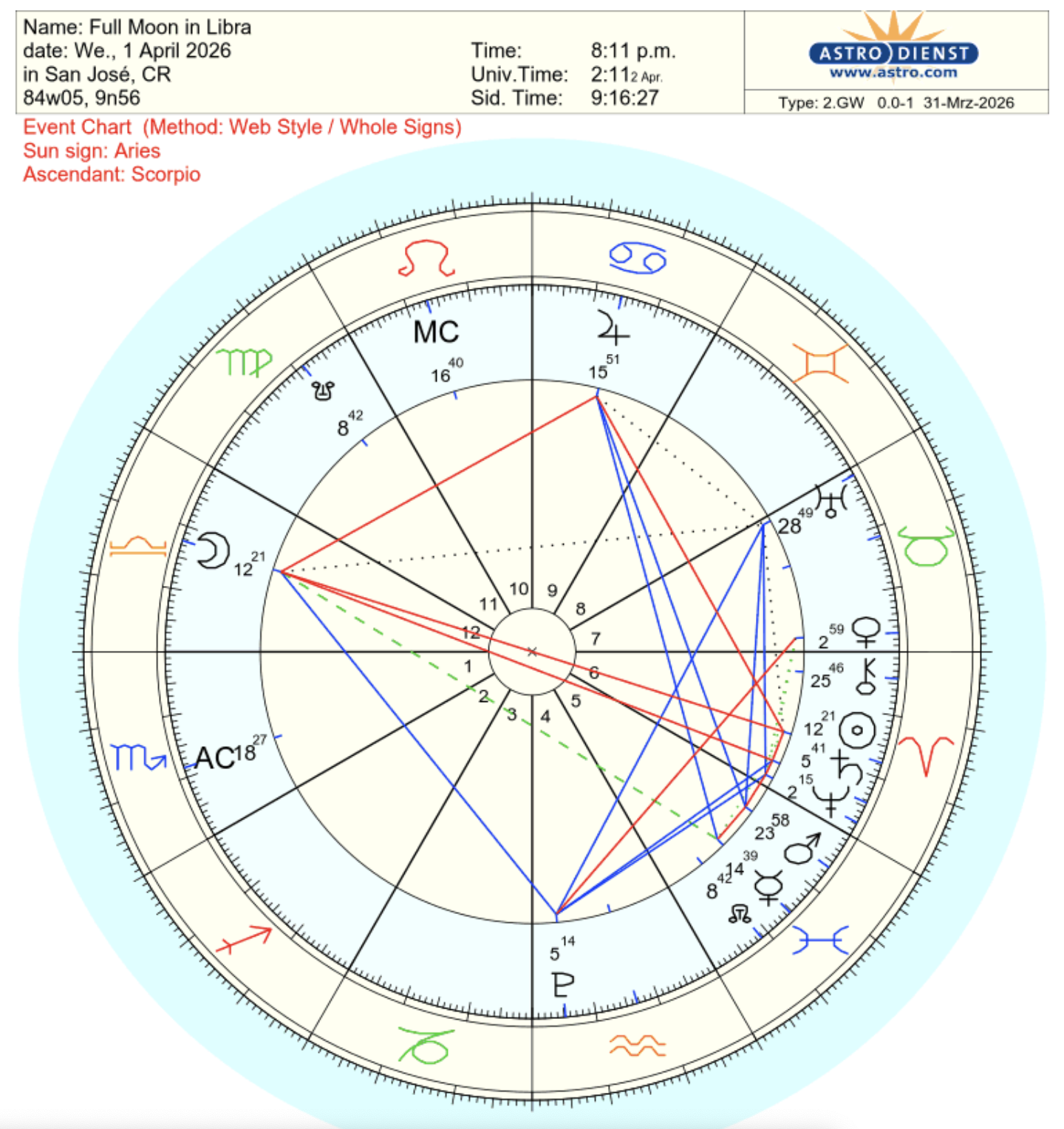 The conversation between Aries (where the Sun is currently) and Libra (where the Moon is in this chart) is always one that navigates the polarity of self and other. Libra wants to please the crowd and smooth things over. Aries wants what it wants, and doesn’t mind upsetting anyone in the process. This Full Moon pulls focus to where we over-extend, compromise, and say yes when we really mean no. The shadows of self-abandonment under the guise of creating harmony will be sharply revealed. The things, people, and situations that you pour and pour into, with little returns, will come under scrutiny.